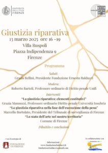 La Fondazione Ernesto Balducci organizza il convegno: “Giustizia riparativa” il 13 marzo 2025 ore 16 -19 a Villa Ruspoli, Piazza Indipendenza 9 Firenze con la collaborazione dell’Università degli Studi di Firenze.