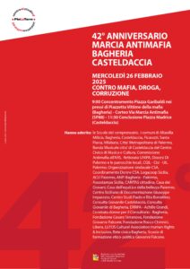 Tutto pronto per il 42° anniversario della “marcia Bagheria-Casteldaccia” contro mafia, droga e corruzione, promossa dal Centro studi “Pio La Torre”, che si celebrerà mercoledì 26 febbraio. Un’edizione alla quale aderiscono numerosi dal mondo istituzionale, associativo, scolastico, sindacale. Ci saranno i Comuni del comprensorio, la Commissione regionale antimafia, le consulte giovanili, fondazioni, singoli cittadini. Realtà che hanno partecipato a un percorso che, aprendo le scuole e tenendo gli incontri al loro interno, ha dimostrato che la memoria può e deve essere protetta e tramandata anche attraverso il confronto intergenerazionale.