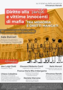 (AGI) – Roma, 20 gen. – Mercoledì 22 gennaio 2025 alle ore 14:30 presso la Sala Zuccari del Senato avrà luogo il convegno ‘Diritto alla verità e vittime innocenti di mafia. Tra memoria e diritti mancati’, organizzato su iniziativa della senatrice Enza Rando, responsabile della lotta alla mafia nella segreteria nazionale del Partito Democratico e componente della commissione bicamerale antimafia.