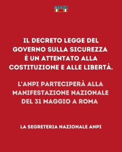 L’ANPI al fine di garantire il rispetto dei diritti costituzionali si batterà per contrastare quanto decretato dal Governo segnalando la pesante minaccia ai diritti e alle libertà dei cittadini, cominciando dalla partecipazione alla manifestazione nazionale del prossimo 31 maggio 2025 lanciata dalla vasta coalizione formatasi per contrastare questa deriva autoritaria”