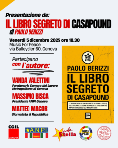 Si terrà venerdì 5 dicembre alle ore 18,30 presso Music For Peace in via Balleydier 60 a Genova, la presentazione del libro di Paolo Berizzi “Il libro segreto di CasaPound”.