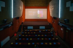 Dietro le tende dell’entrata del cinema si scopre una stanza di sedie in velluto rosso. Su ciascuna, un foglio colorato, ognuno riportante il nome di una vittima innocente di mafia.