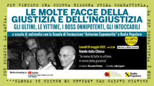 Lunedì 10 maggio ore 21.00 in diretta streaming YouTube sui canali: “Scuola di Formazione Antonino Caponnetto” e “Radio Popolare” la decima e ultima lezione del nuovo ciclo “Le molte facce della giustizia e dell’ingiustizia. Gli ultimi, le vittime, i boss onnipotenti, gli intoccabili”, organizzato dalla Scuola di Formazione Antonino Caponnetto in collaborazione con Radio Popolare.