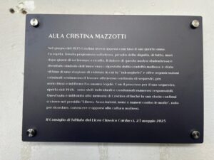 Il 23 maggio 2025, nell’aula appena dedicata a Cristina Mazzotti, si è svolta una cerimonia con la partecipazione della famiglia Mazzotti e degli studenti del liceo Carducci. La targa commemorativa è stata scoperta alla presenza di una folla raccolta che ha voluto testimoniare il valore di questo momento. Arianna, nipote di Cristina, ha preso la parola con parole che hanno toccato i presenti. Ha raccontato quanto significhi per lei vedere riconosciuta la memoria della zia in un luogo così significativo.
