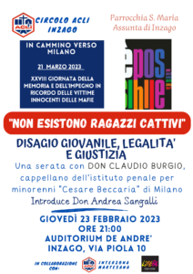 “Non ci sono ragazzi cattivi” è il titolo dell’incontro che si terrà presso l’auditorium del Centro De André a Inzago giovedì 23 febbraio con inizio alle ore 21.