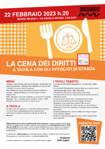 Mercoledì 22 febbraio alle ore 20.00 presso Mosso Milano, in via Angelo Mosso, 3, l’associazione Avvocato di strada organizza “La cena dei diritti”, un’iniziativa ideata per raccogliere fondi e sensibilizzare la cittadinanza sui temi delle persone senza dimora.