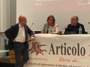 Nella foto il direttore di Articolo 21, Stefano Corradino, la portavoce Elisa Marincola e il coordinatore Giuseppe Giulietti.