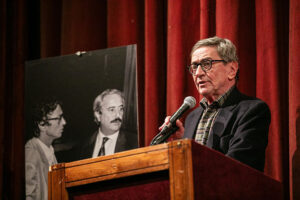 “Dieci anni di mafia” l’avete sentito nominare qui dalle parole di Giovanni Falcone, che fu colpito. Ho riscritto queste due righe che lui ha detto anche questa sera insieme a noi, e mi sembra vivo, mi sembra di sentire la sua voce e di vedere la sua faccia. Lui disse: “Per la prima volta assistiamo a una risposta finalmente corale a questi problemi – la mafia – che parte di pochi o meno pochi funzionari dello Stato portano avanti”. La risposta corale. Tutto cominciò con una risposta corale.