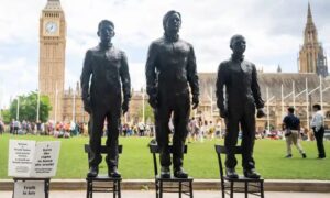 La scultura dedicata ad Assange dell’italiano Dormino davanti all’House of Parliament