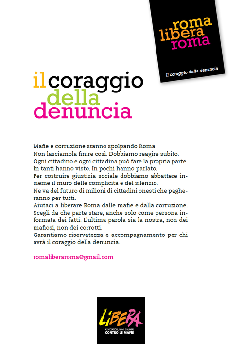“Per costruire giustizia sociale dobbiamo abbattere insieme il muro delle complicità e del silenzio. Ne va del futuro di milioni di cittadini onesti che pagheranno per tutti. Aiutaci a liberare Roma dalle mafie e dalla corruzione. Scegli da che parte stare, anche solo come persona informata dei fatti. L’ultima parola sia la nostra, non dei mafiosi, non dei corrotti. Garantiamo – conclude il manifesto-appello di Libera- riservatezza e accompagnamento per chi avrà il coraggio della denuncia.”