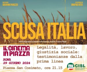 A seguire, sarà proiettato il docufilm Scusa Italia di Giovanni Panozzo (Italia 2023, 63 min), opera che racconta storie e testimonianze di lavoratrici e lavoratori, raccolte nel corso di un viaggio simbolico: una potatura dell’ulivo dedicato a Paolo Borsellino che ha attraversato l’Italia da Palermo per essere benedetta da Papa Francesco in Vaticano per poi essere ripiantata nel giardino di una scuola di Lecco, in memoria di tutte le vittime delle mafie.