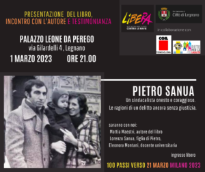 Mercoledì 1 marzo ci troveremo alle 21.00 a Palazzo Leone da Perego a Legnano per la presentazione del libro “Pietro Sanua, un sindacalista onesto e coraggioso. Le ragioni di un delitto ancora senza giustizia”.