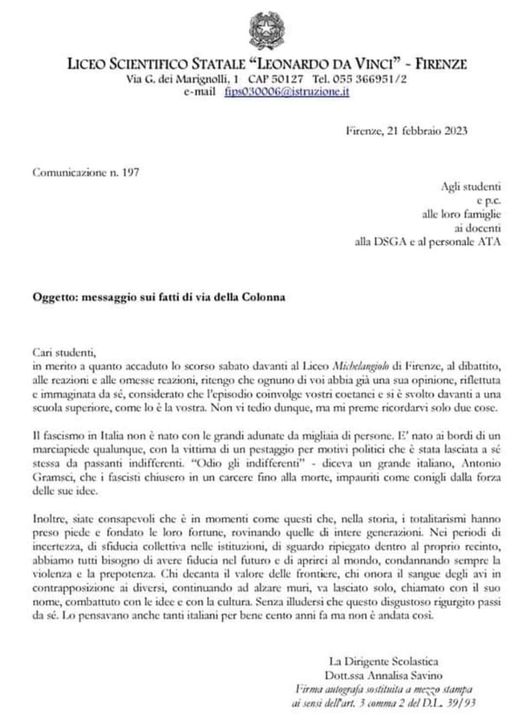 Libera Bergamo, a riguardo dell’episodio di aggressione avvenuta sabato scorso 18 febbraio davanti al liceo Michelangelo di Firenze, nell’esprimere la più piena e convinta condanna dell’accaduto e nel far sua la lettera della Dirigente scolastica Annalisa Savino (in allegato), sottolinea quanto segue.