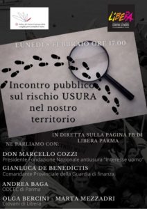 Lunedì 8 febbraio alle ore 17.00 in diretta sulla nostra pagina FB un evento che abbiamo organizzato assieme all’Ordine dei Dottori Commercialisti e degli Esperti Contabili di Parma dal titolo “Il rischio usura nel nostro territorio”.