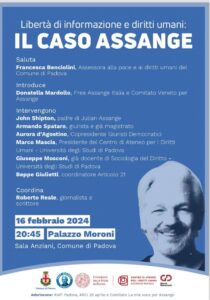 “Libertà di informazione e diritti umani: il caso Assange” è il titolo dell’iniziativa che si tiene il 16 febbraio presso la sala Anziani del Comune di Padova (palazzo Moroni), alle 20.45.
