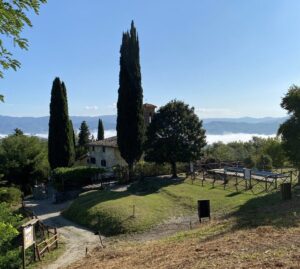 Usciamo dalla chiesa e, se al nostro arrivo la valle del Mugello era ancora nascosta dalla nebbia, ora il sole illumina tutto e un panorama bellissimo ci accoglie tutto intorno.