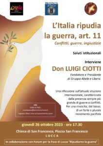 “L’Italia ripudia la guerra, Art.11. Conflitti, guerre, ingiustizie” è il titolo dell’incontro che si terrà il prossimo giovedì 26 ottobre a Lucca e che vedrà la partecipazione di don Luigi Ciotti, fondatore e presidente di Gruppo Abele e Libera.