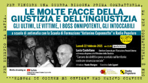 Lunedì 22 febbraio ore 21.00 in diretta streaming YouTube sui canali: “Scuola di Formazione Antonino Caponnetto” e “Radio Popolare” la quarta lezione del nuovo ciclo “Le molte facce della giustizia e dell’ingiustizia. Gli ultimi, le vittime, i boss onnipotenti, gli intoccabili”, organizzato dalla Scuola di Formazione Antonino Caponnetto in collaborazione con Radio Popolare.