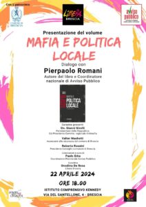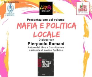 Si svolgerà lunedì 22 aprile, alle ore 18.00, a Brescia, presso l’Istituto comprensivo Kennedy, in via del Santellone, 4, la presentazione del libro “Mafia e politica locale” scritto da Pierpaolo Romani, Coordinatore nazionale di Avviso Pubblico.