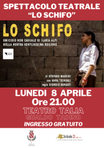 Il Comune di Gualdo Tadino (PG), in collaborazione con Articolo 21, ha organizzato presso il Teatro Talia di Gualdo Tadino alle ore 21 di lunedì 8 Aprile lo spettacolo teatrale, ad ingresso gratuito, “Lo schifo. Omicidio non casuale di Ilaria Alpi”.