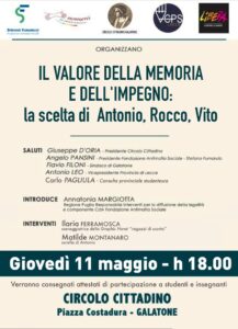 “Mafia e Antimafia: il valore della memoria e dell’impegno. La scelta di Antonio, Rocco, Vito” è il titolo del prossimo appuntamento nell’ambito dell’iniziativa promossa dalla Fondazione Regionale Antimafia Sociale – Stefano Fumarulo, l’Associazione Nomeni per Antonio Montinaro, il Circolo Cittadino Il Galateo, la Consulta Provinciale della Legalità e Libera di Lecce. Associazioni, nomi e numeri contro le mafie.