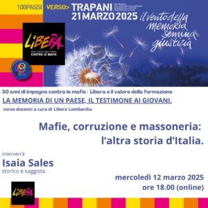“Mafie, corruzione e massoneria: l’altra Storia d’Italia” è il titolo del nuovo appuntamento del Corso di formazione docenti a cura di Libera Lombardia in programma mercoledì 12 marzo alle ore 18.00 (on line).