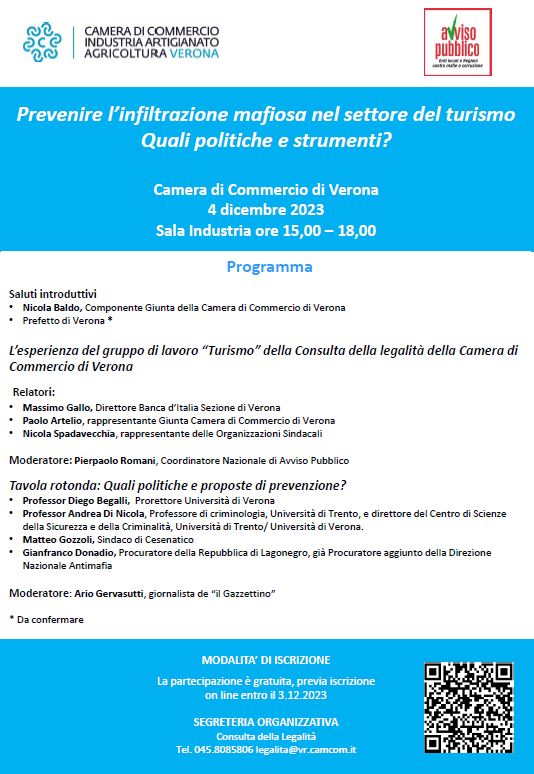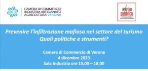 Mafie e turismo: il 4 dicembre alla CCIAA di Verona il convegno della Consulta della Legalità e Avviso Pubblico