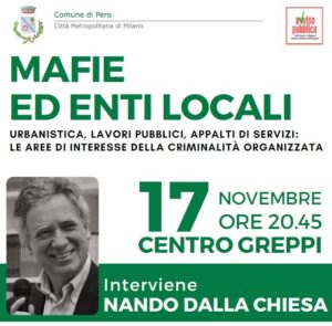Il Comune di Pero, borgo della città metropolitana di Milano, ha organizzato per giovedì 17 novembre alle ore 20.45, un incontro dal titolo “Mafie ed Enti locali – Urbanistica, lavori pubblici, appalti di servizi: le aree di interesse della criminalità organizzata”.