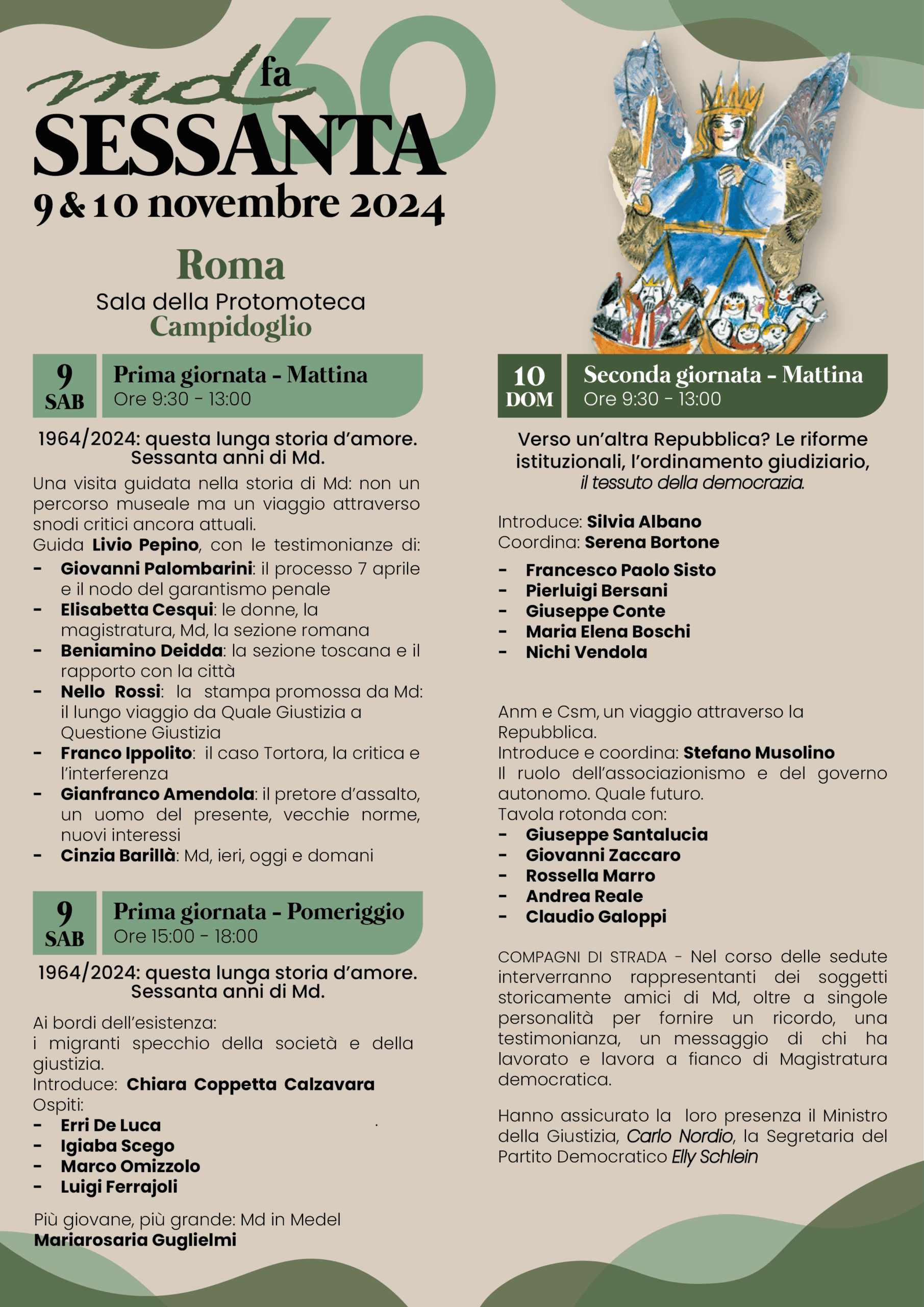 Interverranno figure storiche di Magistratura democratica, come Livio Pepino, Giovanni Palombarini, Nello Rossi, Luigi Ferrajoli, politici come Giuseppe Conte, Maria Elena Boschi, Francesco Paolo Sisto, Elly Schlein, il Ministro della Giustizia Carlo Nordio.