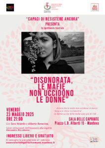 Venerdì 23 maggio, ore 21:00: spettacolo teatrale, “Disonorata, le mafie non uccidono le donne” con Sara Velardo e Alberto Bonacina presso Sala delle Capriate (Piazza L.B. Alberti, 15, Mantova). Si consiglia la prenotazione alla mail osservatoriolegalita@comune.mantova.it.
