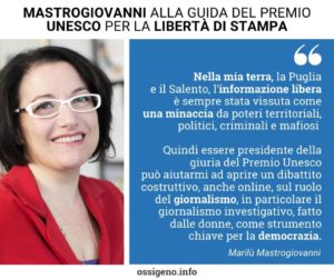 Così la giornalista Marilù Mastrogiovanni, amica e collaboratrice di Ossigeno per l’Informazione, commenta la sua recente nomina a presidente della giuria del Premio Unesco per la libertà di stampa intitolato a Guillermo Cano. A designarla la direttrice generale dell’Unesco Audrey Azouley, conferendole un ruolo assunto per la prima volta da un/una italiana in questa giuria, di cui Mastrogiovanni fa parte per il terzo anno consecutivo.