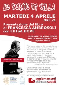 Martedì 4 aprile si svolgerà a Milano, presso la Comunità di Villapizzone, la presentazione del libro “Giorgio Ambrosoli. Dolore, orgoglio, memoria” scritto dalla figlia Francesca Ambrosoli con Luisa Bove e pubblicato da Edizioni San Paolo.