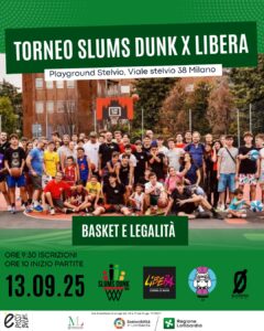 Il nuovo appuntamento del progetto “È possibile insieme: un impegno collettivo di partecipazione e comunità”, finanziato da Regione Lombardia bando Terzo Settore 2023-2025, è il torneo sportivo “Slums Dunk X Libera” che si terrà sabato 13 settembre a Milano presso il Playground Stelvio (via Stelvio 38).