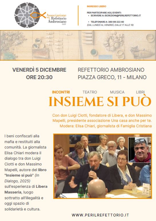 Venerdì 5 dicembre, alle ore 20:30, l’Associazione per il Refettorio Ambrosiano OdV propone una serata dedicata alla legalità e in particolare alla lotta alla mafia, i beni confiscati e restituiti alla comunità.