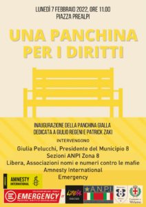 A pochi giorni dalla decisione del Tribunale di Mansura di rinviare al 6 aprile la prima udienza del processo a Patrick Zaki, verrà inaugurata a Milano una panchina gialla simbolo dei diritti e dedicata allo studente egiziano e a Giulio Regeni.