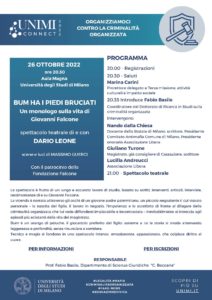 Dopo il travolgente successo dello scorso maggio al Teatro Parenti di Milano, che ha visto il tutto esaurito per una settimana, il monologo Bum ha i piedi bruciati, scritto, diretto e interpretato da Dario Leone viene ora ospitato nell’Aula Magna della Statale di Milano, in occasione della rassegna UNIMI Connect, il programma di public engagement che si inserisce all’interno del progetto “Organizziamoci contro la criminalità organizzata” coordinato dal prof. Fabio Basile, docente di Diritto Penale e coordinatore del dottorato di ricerca in Studi sulla Criminalità organizzata dell’Università degli Studi di Milano.