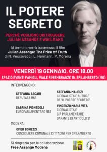 “Il potere segreto. Perché vogliono distruggere Julian Assange e Wikileaks” è il titolo del dibattito che si tiene venerdì 19 gennaio 2024 nello spazio eventi Famigli di Spilamberto (Modena).