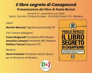 I finanziatori, i misteri del palazzo-fortino nel cuore di Roma occupato dal 2003, il “piano B” eversivo in caso di sgombero, i legami con la destra di governo, la violenza come metodo, i campi di addestramento, i riti pagani-esoterici, la copertura delle istituzioni, i rapporti con i media mainstream: c’è tutto questo, e molto di più, ne “Il libro segreto di CasaPound”, l’ultimo libro del giornalista d’inchiesta Paolo Berizzi, che sarà presentato venerdì 21 novembre alle ore 20.45 a Modena, presso Palazzo Europa.