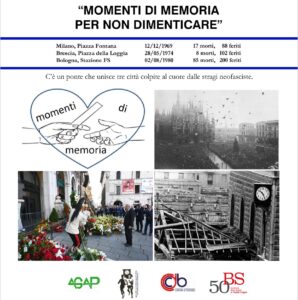 Dal 31 luglio 2024 al 2 agosto 2024 si tiene l’iniziativa Momenti di memoria per non dimenticare, la storica staffetta che dal 1987 collega Milano, Brescia e Bologna, città colpite dalle stragi terroristiche.