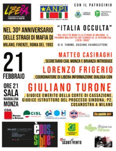 Dopo l’incontro di martedì 24 gennaio con Giovanni Tamburino, autore del volume “Dietro tutte le trame”, che ha affrontato il tema della strategia della tensione in Italia, nuovo appuntamento con il ciclo voluto da Libera Monza Brianza e Anpi Monza Brianza per il trentesimo anniversario delle stragi di mafia di Milano, Firenze e Roma del 1993.