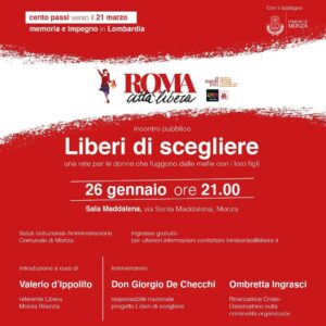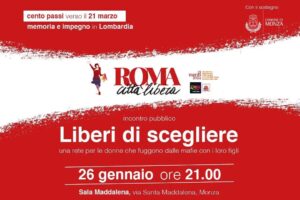 Si terrà venerdì 26 gennaio alle ore 21.00 presso la Sala Maddalena, in via Santa Maddalena a Monza, un incontro pubblico su “Liberi di scegliere. Una rete per le donne che fuggono dalle mafie con i loro figli”.