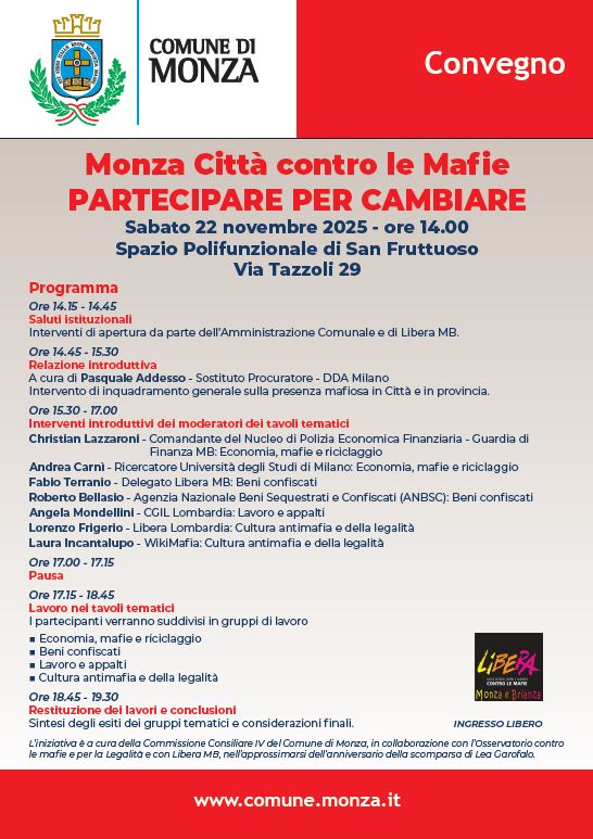 Sabato 22 novembre, dalle ore 14, lo Spazio Polifunzionale di San Fruttuoso in via Tazzoli 29 ospiterà l’iniziativa “Monza Città contro le Mafie – Partecipare per cambiare”, un appuntamento a ingresso libero organizzato dalla Commissione Consiliare IV Affari Generali del Comune di Monza in collaborazione con l’Osservatorio contro le mafie e per la Legalità e con l’Associazione Libera MB.