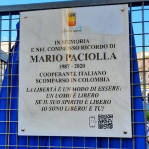 Nel giorno del suo 36 compleanno, è stata intitolata una targa per Mario Paciolla all’ingresso dell’area attrezzata di via F. dell’Erba, uno dei luoghi in cui Mario è vissuto ed è cresciuto.