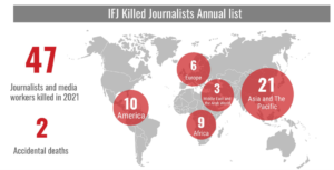 Sono 47 i giornalisti e gli operatori dei media uccisi nel 2021 nello svolgimento del proprio dovere. A darne notizia è IFJ, la Federazione internazionale dei giornalisti che ha pubblicato oggi, 9 febbraio 2022, la ‘2021 Killed list’, il report annuale che descrive anche le circostanze delle uccisioni, avvenute durante attacchi mirati, bombardamenti, episodi di fuoco incrociato. «Si tratta – spiega il sindacato mondiale – del quinto bilancio più basso da quando, nel 1990, la Ifj ha iniziato a pubblicare i rapporti annuali e porta a 2725 il totale di reporter e operatori che da allora hanno perso la vita a causa della violenza nel mondo».