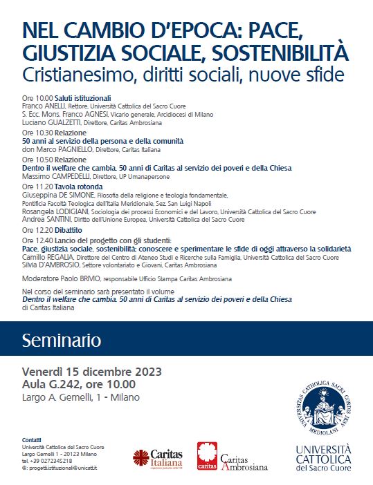 Venerdì 15 dicembre dalle ore 10 presso l’Università Cattolica del Sacro Cuore a Milano si svolgerà il seminario dal titolo: “Nel cambio d’epoca: pace, giustizia sociale, sostenibilità. Cristianesimo, diritti sociali, nuove sfide” per ragionare su prospettive di futuro, muovendo però dal bilancio di un percorso di mezzo secolo compiuto, nella storia della Chiesa e del paese, dalla ramificata famiglia Caritas.
