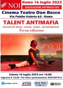 La finale della terza edizione del Talent si terrà al Teatro Cinema Don Bosco (in via Publio Valerio, 63 a Roma) sabato 16 luglio 2022 dalle 16. Il tema è quello di sempre: “No alla mafia, sì alla legalità”. Quattro le categorie di concorso: danza, musica, teatro e narrativa/poesia; 12 i finalisti provenienti da tutta Italia.