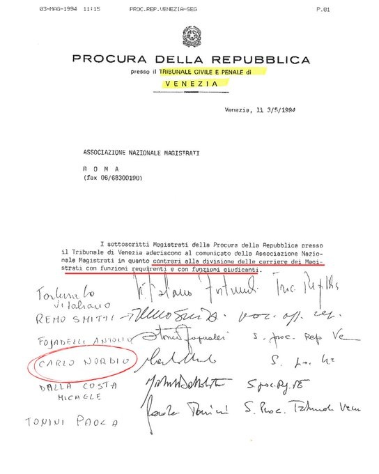 Purtroppo non è un gioco, ma una realtà. Un articolo pubblicato dal “Fatto” il 1° novembre scorso rivela che tra i firmatari di un documento del 3 maggio 1974, redatto dai magistrati della Procura di Venezia e radicalmente contrario alla separazione delle carriere fra Pm e giudici, figura anche  tal  Carlo Nordio.