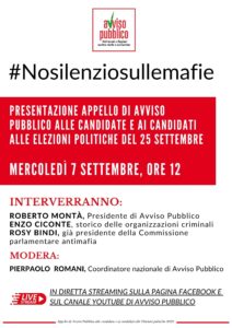 L’Appello #NOSILENZIOSULLEMAFIE sarà presentato Mercoledì 7 settembre, alle ore 12,00, in diretta streaming sulla pagina Facebook e sul canale YouTube di Avviso Pubblico, insieme a: