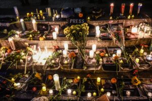 This week, CPJ joined in solidarity with journalists and press freedom advocates who gathered to mourn their colleagues killed during the ongoing war. The heartfelt gathering was organized by photojournalist David Delgado and colleagues whose moving tribute to the lives of those who bear witness at immense cost, was echoed with candles and flowers from attendees.