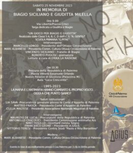Sabato 25 novembre 2023 il Centro Studi Paolo e Rita Borsellino e l’Associazione dei Giuristi Siciliani A.GIU.S. con il patrocinio gratuito dell’Ottava Circoscrizione di Palermo, organizzano due eventi in memoria di Giuditta Milella e Biagio Siciliano, studenti del Liceo Meli morti nel tragico incidente del 1985 che coinvolse un’auto di scorta dei giudici Guarnotta e Borsellino.